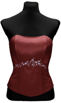Gorset z fiszbinami wiązany z tyłu, Gorsetem podkreślisz piękne ramiona i uwydatnisz biust, wiązaniem z tyłu dobrze go dopasujesz. Materiał - połyskująca tafta z kwiatowym haftem.  Dopasowana góra, podkreślona talia  to klasa i styl. Gorset uzupełni twoją garderobę, można nosić go zarówno do spodni jak i spódnic.