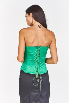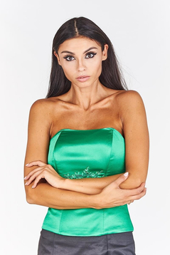 Gorset z fiszbinami wiązany z tyłu, Gorsetem podkreślisz piękne ramiona i uwydatnisz biust, wiązaniem z tyłu dobrze go dopasujesz. Materiał - połyskująca tafta z kwiatowym haftem.  Dopasowana góra, podkreślona talia  to klasa i styl. Gorset uzupełni twoją garderobę, można nosić go zarówno do spodni jak i spódnic.
