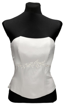 Gorset z fiszbinami wiązany z tyłu, Gorsetem podkreślisz piękne ramiona i uwydatnisz biust, wiązaniem z tyłu dobrze go dopasujesz. Materiał - połyskująca tafta z kwiatowym haftem. Dopasowana góra, podkreślona talia to klasa i styl. Gorset uzupełni twoją garderobę, można nosić go zarówno do spodni jak i spódnic.