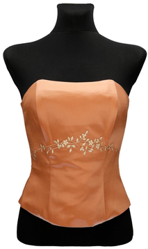 Gorset z fiszbinami wiązany z tyłu, Gorsetem podkreślisz piękne ramiona i uwydatnisz biust, wiązaniem z tyłu dobrze go dopasujesz. Materiał - połyskująca tafta z kwiatowym haftem.  Dopasowana góra, podkreślona talia  to klasa i styl. Gorset uzupełni twoją garderobę, można nosić go zarówno do spodni jak i spódnic.