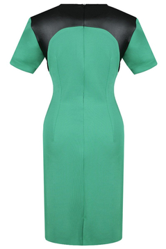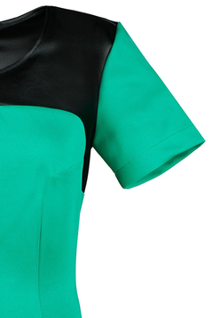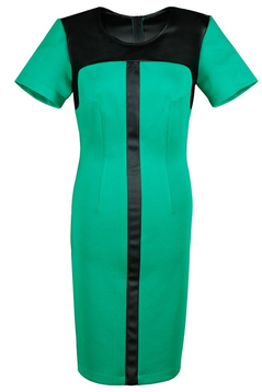 Sukienka dopasowana, podkreśla kobiece wdzięki. Tkanina elastyczna połączona z modną również w obecnym sezonie skórą ekologiczną. Dekolt okrągły. Karczek fantazyjne odcięty. Suwak kryty z tyłu. Na dole niewielkie pęknięcie umożliwiające swobodne chodzenie. Bez podszewki. Sukienka codzienna, doskonale sprawdzi się w pracy biurowej, jak i na nieoficjalnych spotkaniach rodzinnych. Dedykowana dla kobiet w różnym wieku, które pragną czuć się komfortowo i wyglądać atrakcyjnie.