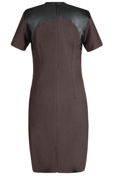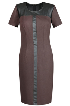 Sukienka dopasowana, podkreśla kobiece wdzięki. Tkanina elastyczna połączona z modną również w obecnym sezonie skórą ekologiczną. Dekolt okrągły. Karczek fantazyjne odcięty. Suwak kryty z tyłu. Na dole niewielkie pęknięcie umożliwiające swobodne chodzenie. Bez podszewki. Sukienka codzienna, doskonale sprawdzi się w pracy biurowej, jak i na nieoficjalnych spotkaniach rodzinnych. Dedykowana dla kobiet w różnym wieku, które pragną czuć się komfortowo i wyglądać atrakcyjnie.
