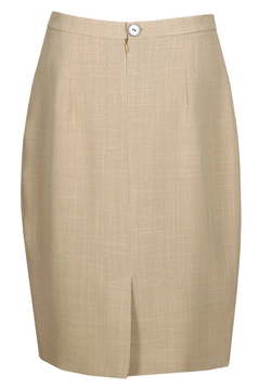 Klasyczna, ołówkowa spódnica. W tali pasek o szerokości 3 cm, zapinany z tyłu na 1 guzik. Suwak kryty. Na dole rozporek zakładany, ułatwiający chodzenie. Uszyta ze stabilnej tkaniny. Jest podszewka. Dół podszyty ściegiem krytym. Bardzo uniwersalna spódnica, w zależności od pozostałych części garderoby, może mieć szerokie zastosowanie, np. w połączeniu z białą bluzką tworzy strój wizytowy, w zestawieniu z gładkim golfem – odpowiedni ubiór do pracy.
