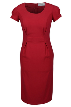 Klasyczna, dopasowana sukienka. Dekolt okrągły. Rękaw krótki, z ozdobnym marszczeniem. Ocięcie w talii, podkreślone paskiem. Na przodzie cięcia francuskie, zaakcentowane w pasie drobnymi kontrafałdami. Z tyłu suwak kryty, zaszewki taliowe, oraz na dole rozporek zakładany. Sukienka została uszyta z tkaniny elastycznej. Miła w dotyku, nie ulega mechaceniu i nadmiernemu gnieceniu. Bez podszewki. Sukienka powstała z myślą o kobietach dojrzałych, lubiących wyglądać modnie i elegancko przy każdej okazji.