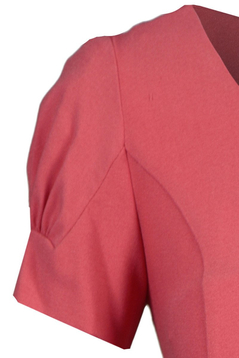 Klasyczna, dopasowana sukienka. Dekolt okrągły. Rękaw krótki, z ozdobnym marszczeniem. Ocięcie w talii, podkreślone paskiem. Na przodzie cięcia francuskie, zaakcentowane w pasie drobnymi kontrafałdami. Z tyłu suwak kryty, zaszewki taliowe, oraz na dole rozporek zakładany. Sukienka została uszyta z tkaniny elastycznej. Miła w dotyku, nie ulega mechaceniu i nadmiernemu gnieceniu. Bez podszewki. Sukienka powstała z myślą o kobietach dojrzałych, lubiących wyglądać modnie i elegancko przy każdej okazji.