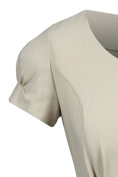 Klasyczna, dopasowana sukienka. Dekolt okrągły. Rękaw krótki, z ozdobnym marszczeniem. Ocięcie w talii, podkreślone paskiem. Na przodzie cięcia francuskie, zaakcentowane w pasie drobnymi kontrafałdami. Z tyłu suwak kryty, zaszewki taliowe, oraz na dole rozporek zakładany. Sukienka została uszyta z tkaniny elastycznej. Miła w dotyku, nie ulega mechaceniu i nadmiernemu gnieceniu. Bez podszewki. Sukienka powstała z myślą o kobietach dojrzałych, lubiących wyglądać modnie i elegancko przy każdej okazji.