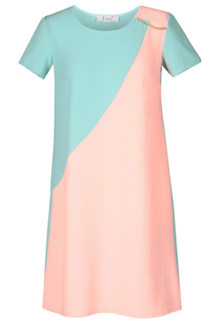 Sukienka w kształcie trapezu. Dopasowana jedynie w biuście, natomiast w pasie i biodrach luźna. Dekolt okrągły. Rękaw krótki. Przód oryginalnie zaprojektowany, z boku przy ramieniu ozdobny łańcuszek. Sukienka została uszyta z najwyższej jakości tkaniny. Jest bardzo przyjemna w dotyku. Nie ulega mechaceniu. Bez podszewki. Sukienka powstała z myślą o dziewczynach i kobietach w różnym wieku. Przeznaczona do noszenia na co dzień. Jeśli chcesz czuć się komfortowo i wyglądać elegancko, to ta sukienka jest właśnie dla Ciebie.