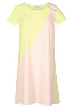 Sukienka w kształcie trapezu. Dopasowana jedynie w biuście, natomiast w pasie i biodrach luźna. Dekolt okrągły. Rękaw krótki. Przód oryginalnie zaprojektowany, z boku przy ramieniu ozdobny łańcuszek. Sukienka została uszyta z najwyższej jakości tkaniny. Jest bardzo przyjemna w dotyku. Nie ulega mechaceniu. Bez podszewki. Sukienka powstała z myślą o dziewczynach i kobietach w różnym wieku. Przeznaczona do noszenia na co dzień. Jeśli chcesz czuć się komfortowo i wyglądać elegancko, to ta sukienka jest właśnie dla Ciebie.