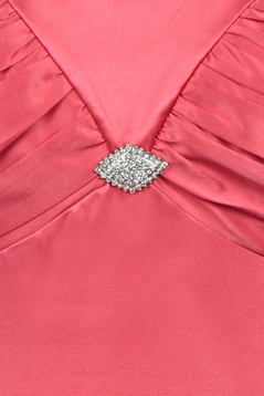 Sukienka o linii trapezu. Dekolt serek. Ramiączka szerokie - 9 cm. Bez rękawa. Na biuście ozdobne marszczenia. Na środku przodu broszka. Pod biustem odcięcie, poniżej cięcia pionowe. Suwak kryty z tyłu. Sukienka uszyta z satyny. Jest to tkanina z delikatnym połyskiem, elastyczna, nie ulega nadmiernemu gnieceniu i mechaceniu. Jest podszewka. Sukienka idealna na wesela, komunie i wiele innych okazji.