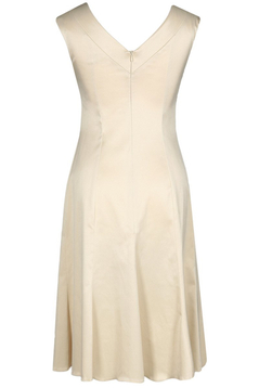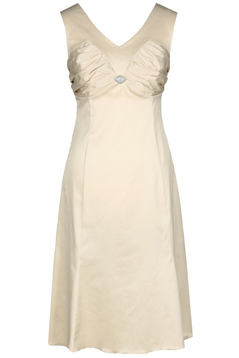 Sukienka o linii trapezu. Dekolt serek. Ramiączka szerokie - 9 cm. Bez rękawa. Na biuście ozdobne marszczenia. Na środku przodu broszka. Pod biustem odcięcie, poniżej cięcia pionowe. Suwak kryty z tyłu. Sukienka uszyta z satyny. Jest to tkanina z delikatnym połyskiem, elastyczna, nie ulega nadmiernemu gnieceniu i mechaceniu. Jest podszewka. Sukienka idealna na wesela, komunie i wiele innych okazji.
