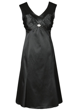 Sukienka o linii trapezu. Dekolt serek. Ramiączka szerokie - 9 cm. Bez rękawa. Na biuście ozdobne marszczenia. Na środku przodu broszka. Pod biustem odcięcie, poniżej cięcia pionowe. Suwak kryty z tyłu. Sukienka uszyta z satyny. Jest to tkanina z delikatnym połyskiem, elastyczna, nie ulega nadmiernemu gnieceniu i mechaceniu. Jest podszewka. Sukienka idealna na wesela, komunie i wiele innych okazji.