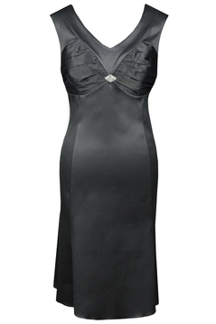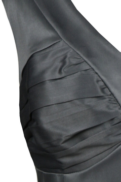 Sukienka o linii trapezu. Dekolt serek. Ramiączka szerokie - 9 cm. Bez rękawa. Na biuście ozdobne marszczenia. Na środku przodu broszka. Pod biustem odcięcie, poniżej cięcia pionowe. Suwak kryty z tyłu. Sukienka uszyta z satyny. Jest to tkanina z delikatnym połyskiem, elastyczna, nie ulega nadmiernemu gnieceniu i mechaceniu. Jest podszewka. Sukienka idealna na wesela, komunie i wiele innych okazji.
