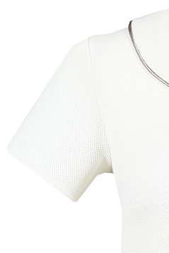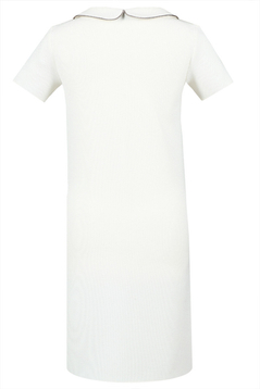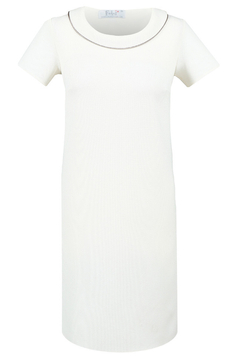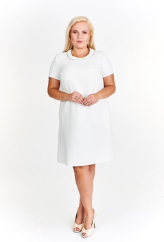 Sukienka w kształcie trapezu. Dopasowana w biuście, natomiast w pasie oraz biodrach luźna. Dekolt okrągły wykończony wąskim kołnierzykiem. Kołnierzyk podkreślony kontrastową wypustką. Rękawy krótkie, lewy rękawek ozdobiony złotą blaszką w kształcie kokardki. Zaszewki piersiowe modelujące biust. W szwach bocznych kieszenie. Sukienka została uszyta ze strukturalnej dzianiny. Jest miła w dotyku, nie ulega gnieceniu. Skład surowcowy: 69% poliamid, 31% elastan. Bez podszewki. Sukienka nie posiada suwaka, swobodnie się zakłada. Sukienka idealna na codzienne letnie dni, ale przy odpowiednim dobraniu dodatków, można ją również wykorzystać na przeróżne spotkania nieformalne.