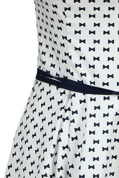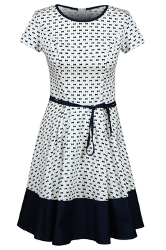 Rozkloszowana sukienka z krótkim rękawem. Dekolt okrągły, wykończony lamówką. Cięcia francuskie z przodu i z tyłu. Od talii z przodu i z tyłu - dwie kontrafałdy. Pas na dole uszyty został z gładkiego materiału – tego samego co lamówka przy dekolcie. W zestawie, wąski, zawiązywany pasek. Z tyłu na środku kryty zamek. Sukienka z naturalnego surowca, idealna na wiosnę i lato. Uniwersalna, odpowiednia na różne imprezy okolicznościowe, spotkania rodzinne i biznesowe, na co dzień. Urocza i dodająca wdzięku, sprawia że każda kobieta wygląda w niej młodo i atrakcyjnie.
