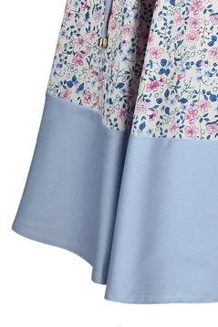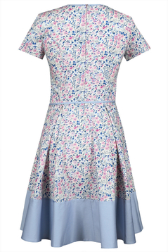 Rozkloszowana sukienka z krótkim rękawem. Dekolt okrągły, wykończony lamówką. Cięcia francuskie z przodu i z tyłu. Od talii z przodu i z tyłu - dwie kontrafałdy. Pas na dole uszyty został z gładkiego materiału – tego samego co lamówka przy dekolcie. W zestawie, wąski, zawiązywany pasek. Z tyłu na środku kryty zamek. Sukienka z naturalnego surowca, idealna na wiosnę i lato. Uniwersalna, odpowiednia na różne imprezy okolicznościowe, spotkania rodzinne i biznesowe, na co dzień. Urocza i dodająca wdzięku, sprawia że każda kobieta wygląda w niej młodo i atrakcyjnie.