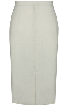 Klasyczna, ołówkowa spódnica. W tali pasek o szerokości 3 cm, zapinany z tyłu na 1 guzik. Suwak kryty. Na dole rozporek zakładany, ułatwiający chodzenie. Uszyta ze stabilnej tkaniny. Jest podszewka. Dół podszyty ściegiem krytym. Bardzo uniwersalna spódnica, w zależności od pozostałych części garderoby, może mieć szerokie zastosowanie, np. w połączeniu z białą bluzką tworzy strój wizytowy, w zestawieniu z gładkim golfem – odpowiedni ubiór do pracy.