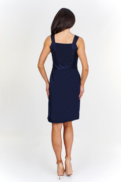 Dopasowana sukienka. Dekolt sercowe karo. Ramiączka szerokie - 5 cm. Bez rękawa. Odcięcie w talii, podkreślone paskiem. Karczek przodu oraz dół zakładane kopertowo. Suwak kryty w lewym boku. Sukienka uszyta z tkaniny delikatnie elastycznej. Nie ulega nadmiernemu gnieceniu i mechaceniu. Jest podszewka. Dół wykończony ściegiem krytym. Sukienkę polecamy kobietom młodym, chcącym wyglądać modnie i elegancko.