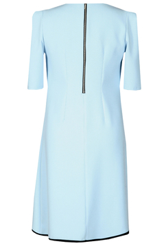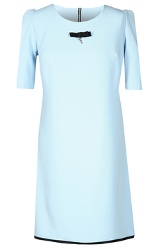 Codzienna sukienka. Fason trapez. Dopasowana jest jedynie w biuście, w pasie i w biodrach luźna. Dekolt okrągły. Poniżej ozdobna czarna kokardka z firmową przywieszką. Rękaw sięgający do łokcia, z oryginalną zakładką przy ramieniu. Zapinana z tyłu na ozdobny metalowy suwak. Tył prosty. Jest podszewka. Dół wykończony czarną lamówką. Sukienkę polecamy kobietom w każdym wieku, idealna na co dzień do pracy, jak również na prywatne spotkania. Sukienkę powinny nosić kobiety o wąskich ramionach i szerokich biodrach.
