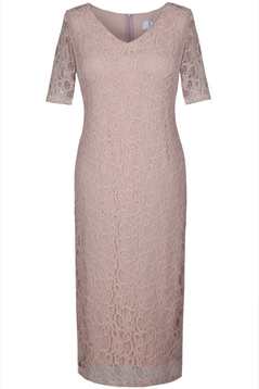 Klasyczna, dopasowana, zwężająca się dołem, ołówkowa sukienka. Dekolt serek. Rękaw krótki. Z tyłu zaszewki taliowe, oraz rozporek pozwalający swobodnie stawiać kroki. Zapinana na suwak kryty z tyłu, ułatwiający zakładanie. Uszyta z elastycznej, niezwykle szykownej koronki. Pod koronką znajduje się bardzo miła w dotyku wiskoza. Sukienka wizytowa, idealna na wesele, studniówkę, sylwester, czy wiele innych uroczystości.