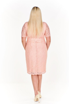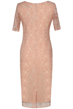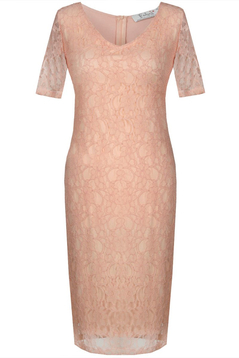 Klasyczna, dopasowana, zwężająca się dołem, ołówkowa sukienka. Dekolt serek. Rękaw krótki. Z tyłu zaszewki taliowe, oraz rozporek pozwalający swobodnie stawiać kroki. Zapinana na suwak kryty z tyłu, ułatwiający zakładanie. Uszyta z elastycznej, niezwykle szykownej koronki. Pod koronką znajduje się bardzo miła w dotyku wiskoza. Sukienka wizytowa, idealna na wesele, studniówkę, sylwester, czy wiele innych uroczystości.