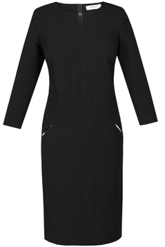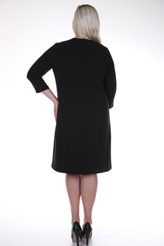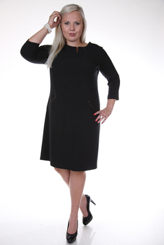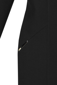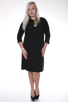 Klasyczna, prosta sukienka. Dekolt okrągły, podkreślony metalową ozdobą, poniżej rozcięcie. Na biuście poziome zaszewki, przebiegające do boku. Na środku przodu znajdują się dwa pionowe pasy o szerokości 4 cm każdy. W okolicy bioder skośne kieszenie zaakcentowane blaszkami. Sukienka została uszyta z przyjemnej w dotyku, delikatnie elastycznej tkaniny. Materiał nie ulega mechaceniu. Z tyłu suwak kryty oraz zaszewki modelujące talię. Sukienka została zaprojektowana z myślą o kobietach dojrzałych. Sukienka jest bardzo funkcjonalna. Można ją włożyć do pracy biurowej, na spotkania rodzinne jak i służbowe, oraz na wiele innych okazji.