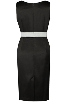 Dopasowana, ołówkowa sukienka. Uszyta została z bardzo eleganckiej, delikatnie połyskującej tkaniny. Wykończona podszewką. Bez rękawów. Dekolt okrągły z zakładkami, zaakcentowany wypustką. Cięcia francuskie. W talii znajduje się pasek w kontrastowym kolorze, podkreślony wypustkami takimi samymi, jak przy dekolcie oraz ozdobną aplikacją po lewej stronie przodu. Na środku z tyłu kryty zamek, na dole rozcięcie, po bokach zaszewki modelujące. Sukienka idealna na wesele, Komunię lub inną imprezę okolicznościową. Prosty krój sukienki z ciekawym dekoltem sprawi, że każda dojrzała kobieta będzie w niej czuć się dobrze oraz wyglądać atrakcyjnie.