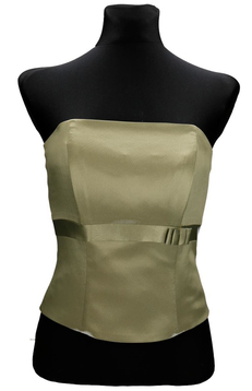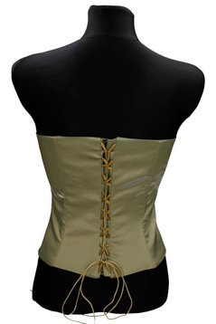 Gorset z fiszbinami wiązany z tyłu. Z przodu gorset jest delikatnie wydłużony , a górna część lekko zabudowana. Talia jest podkreślona taśmą satynową z fantazyjną kokardką. Gorsetem podkreślisz piękne ramiona i uwydatnisz biust, wiązaniem z tyłu dobrze go dopasujesz. Materiał- połyskująca satyna. Dopasowana góra, podkreślona talia to klasa i styl.