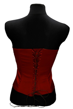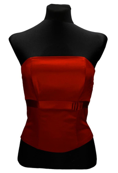 Gorset z fiszbinami wiązany  z tyłu. Z przodu gorset jest delikatnie wydłużony , a górna część lekko zabudowana. Talia jest podkreślona taśmą satynową z fantazyjną kokardką. Gorsetem podkreślisz piękne ramiona i uwydatnisz biust, wiązaniem z tyłu dobrze go dopasujesz. Materiał- połyskująca satyna Dopasowana góra, podkreślona talia  to klasa i styl.