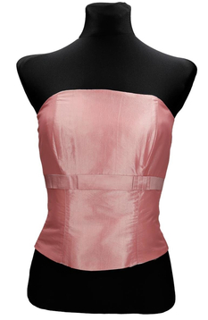 Gorset z fiszbinami wiązany  z tyłu. Z przodu gorset jest delikatnie wydłużony , a górna część lekko zabudowana. Talia jest podkreślona taśmą satynową z fantazyjną kokardką. Gorsetem podkreślisz piękne ramiona i uwydatnisz biust, wiązaniem z tyłu dobrze go dopasujesz. Materiał- połyskująca satyna Dopasowana góra, podkreślona talia  to klasa i styl.