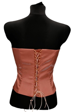 Gorset z fiszbinami wiązany  z tyłu. Z przodu gorset jest delikatnie wydłużony , a górna część lekko zabudowana. Talia jest podkreślona taśmą satynową z fantazyjną kokardką. Gorsetem podkreślisz piękne ramiona i uwydatnisz biust, wiązaniem z tyłu dobrze go dopasujesz. Materiał- połyskująca satyna Dopasowana góra, podkreślona talia  to klasa i styl.