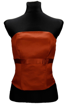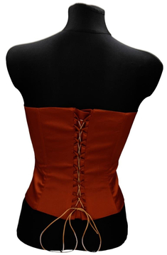 Gorset z fiszbinami wiązany  z tyłu. Z przodu gorset jest delikatnie wydłużony , a górna część lekko zabudowana. Talia jest podkreślona taśmą satynową z fantazyjną kokardką. Gorsetem podkreślisz piękne ramiona i uwydatnisz biust, wiązaniem z tyłu dobrze go dopasujesz. Materiał- połyskująca satyna Dopasowana góra, podkreślona talia  to klasa i styl.
