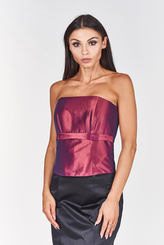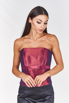 Gorset z fiszbinami wiązany  z tyłu. Z przodu gorset jest delikatnie wydłużony , a górna część lekko zabudowana. Talia jest podkreślona taśmą satynową z fantazyjną kokardką. Gorsetem podkreślisz piękne ramiona i uwydatnisz biust, wiązaniem z tyłu dobrze go dopasujesz. Materiał- połyskująca satyna Dopasowana góra, podkreślona talia  to klasa i styl.
