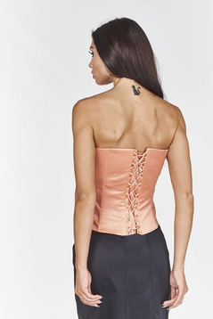 Gorset z fiszbinami wiązany  z tyłu. Z przodu gorset jest delikatnie wydłużony , a górna część lekko zabudowana. Talia jest podkreślona taśmą satynową z fantazyjną kokardką. Gorsetem podkreślisz piękne ramiona i uwydatnisz biust, wiązaniem z tyłu dobrze go dopasujesz. Materiał- połyskująca satyna Dopasowana góra, podkreślona talia  to klasa i styl.