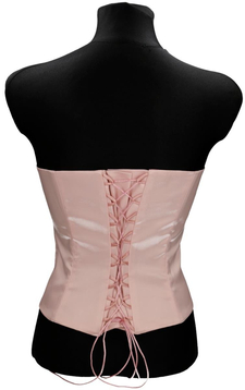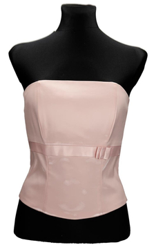 Gorset z fiszbinami wiązany z tyłu. Z przodu gorset jest delikatnie wydłużony , a górna część lekko zabudowana. Talia jest podkreślona taśmą satynową z fantazyjną kokardką. Gorsetem podkreślisz piękne ramiona i uwydatnisz biust, wiązaniem z tyłu dobrze go dopasujesz. Materiał- połyskująca satyna. Dopasowana góra, podkreślona talia to klasa i styl.