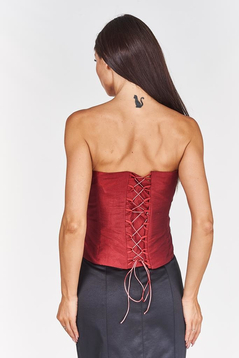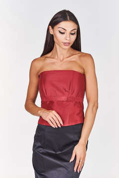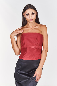Gorset z fiszbinami wiązany z tyłu. Z przodu gorset jest delikatnie wydłużony , a górna część lekko zabudowana. Talia jest podkreślona taśmą satynową z fantazyjną kokardką. Gorsetem podkreślisz piękne ramiona i uwydatnisz biust, wiązaniem z tyłu dobrze go dopasujesz. Materiał- połyskująca satyna. Dopasowana góra, podkreślona talia to klasa i styl.