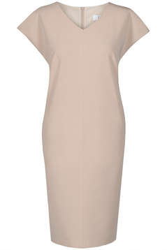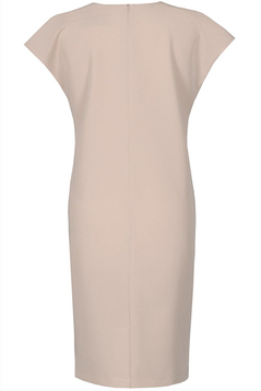 Sukienka dopasowana jedynie w biodrach, w pasie oraz biuście delikatnie luźna. Sukienka posiada szpiczasty dekolt, dzięki czemu świetnie podkreśla biust. Na przodzie sukienka posiada zaszewki piersiowe, które dodatkowo modelują piersi. Sukienka sprawdzi się u kobiet w każdym wieku. Fason bardzo uniwersalny, sprawdzi się na co dzień, do pracy biurowej lub na różnego rodzaju spotkania w gronie rodziny, czy znajomych.