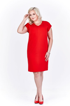 Sukienka dopasowana jedynie w biodrach, w pasie oraz biuście delikatnie luźna. Sukienka posiada szpiczasty dekolt, dzięki czemu świetnie podkreśla biust. Na przodzie sukienka posiada zaszewki piersiowe, które dodatkowo modelują piersi. Sukienka sprawdzi się u kobiet w każdym wieku. Fason bardzo uniwersalny, sprawdzi się na co dzień, do pracy biurowej lub na różnego rodzaju spotkania w gronie rodziny, czy znajomych.