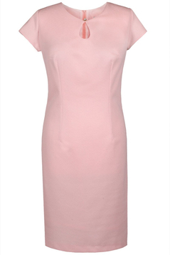 Elegancka, koktajlowa sukienka wykonana z wysokiej jakości krepy sukienkowej. Tkanina ma ciekawą „dziurkowaną” fakturę i przeplatana jest delikatnie mieniącą się nitką. Klasyczny, ołówkowy krój maskuje drobne mankamenty figury i uwydatnia jej zalety. Dekolt w łezkę, ozdobiony złotym guziczkiem dodaje sukience charakteru i lekkości.