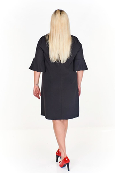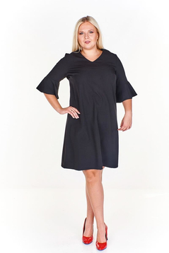 Sukienka z rozkloszowanym rękawem, układająca się w linię trapezu to propozycja dla pań, które lubią stonowane, klasyczne barwy, ale cenią sobie też nieszablonowe podejście do mody. Falbanka, jako zakończenie krótkiego rękawka, jest bardzo dziewczęca, ale nie infantylna, subtelnie odwróci uwagę od mocniej zbudowanych rąk. Kształt sukienki, układający się w linię A, zamaskuje zbyt obfite biodra, a paniom o figurze jabłka, optycznie je "stworzy". Dość luźny fason tej propozycji pozwoli czuć się i stylowo, i wygodnie. Uwagę zwraca tu też dekolt w literę V, który ładnie wydłuża szyję. Długość do kolana zapewni totalny komfort użytkowania i zimą w zestawieniu z płaszczem i na biznesowej kolacji w letniej scenerii.
