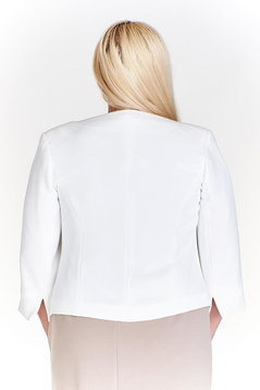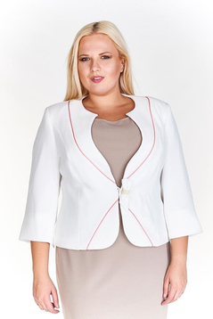 Żakiet luźny. Bez kołnierza. W ramionach znajdują się poduszki modelujące. Rękaw długości ¾. Przód ozdobiony wypustkami w kontrastującym kolorze. Zapinany na jeden, niewidoczny na zewnątrz guzik z pętelką. Na jego miejscu ozdobna kokarda z koralikami.