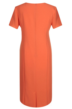 Sukienka prosta, z krótkim rękawem. Na przodzie cięcia francuskie modelujące biust i talię. Przy dekolcie wstawka, na niej ozdoba w postaci wypustki i koralików. Z tyłu cięcia francuskie, kryty suwak oraz rozporek na dole, umożliwiający swobodne chodzenie. Sukienka idealnie nadaje się na formalne i mniej formalne spotkania, a przy odpowiednich dodatkach nawet na wesela.